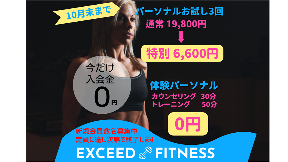 これまで自己流でダイエットをされて、ダイエットが辛くてなかなか痩せれない、痩せたのにすぐリバウンドをする、等のお悩みをお持ちの方で本気で痩せたい方がいれば、是非この機会にエクシードフィットネスでダイエットを始めてみませんか?
